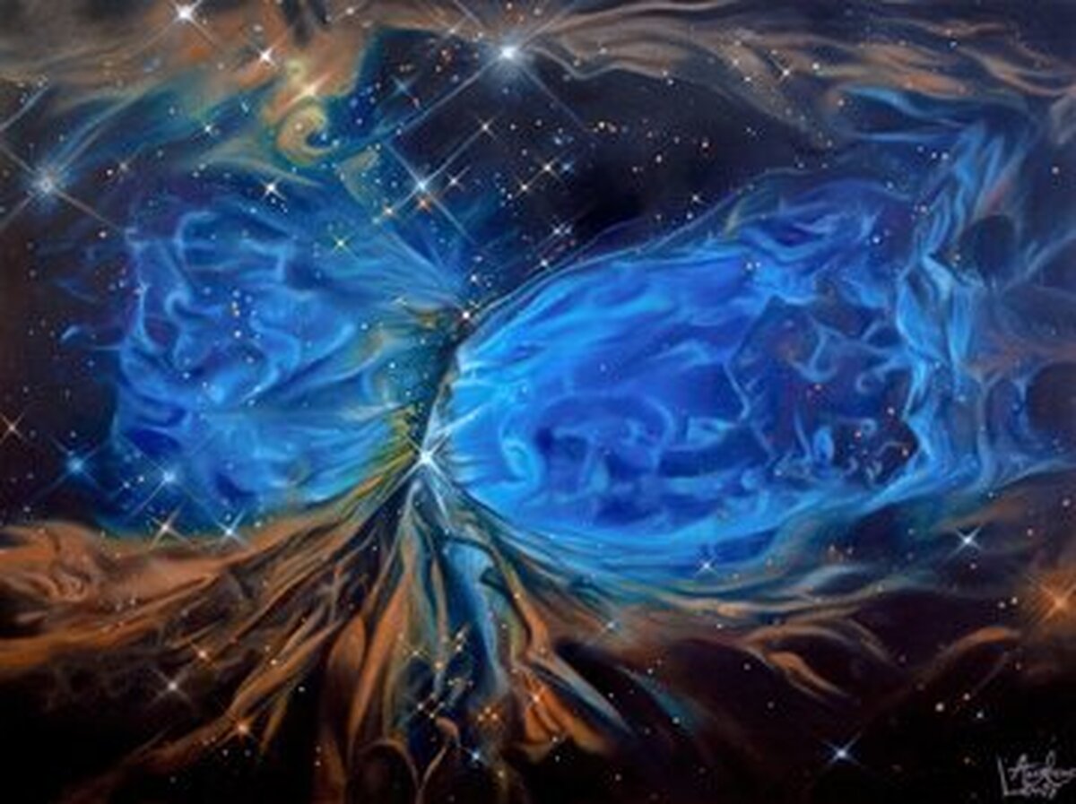 در مرکز این تصویر، دو بخش دوقطبی آبی روشن از گاز داغ و رگههای سرخ تیره، تابش نور آبی از این سحابی را احاطه کردهاند.