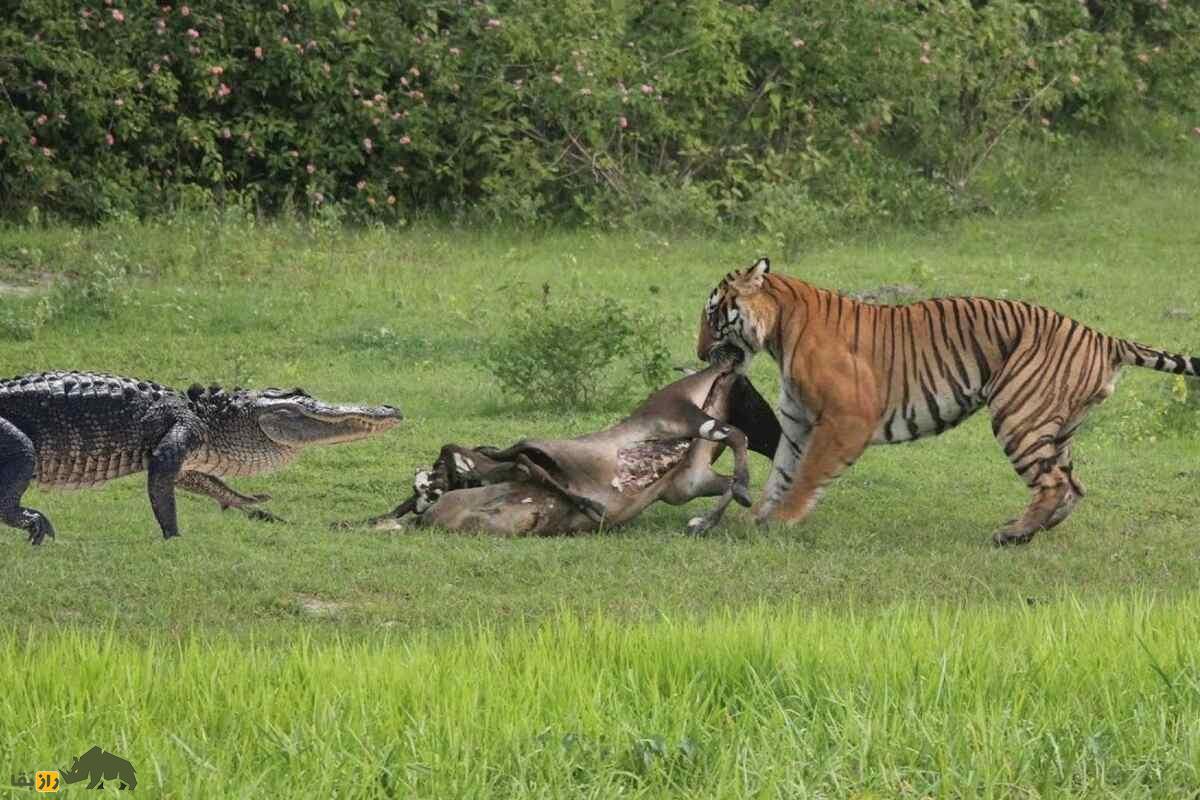 راز بقا: این ویدئو صحنه هیجان‌انگیز مبارزه بین ببر و تمساح را نشان می‌دهد که برای شکار گراز درگیر شده‌اند. این رفتار شکارچیان قدرتمند به‌خوبی روابط پیچیده زنجیره غذایی را نمایش می‌دهد. مشاهده این نبرد طبیعی، بینشی جالب از زندگی وحشی ارائه می‌دهد.