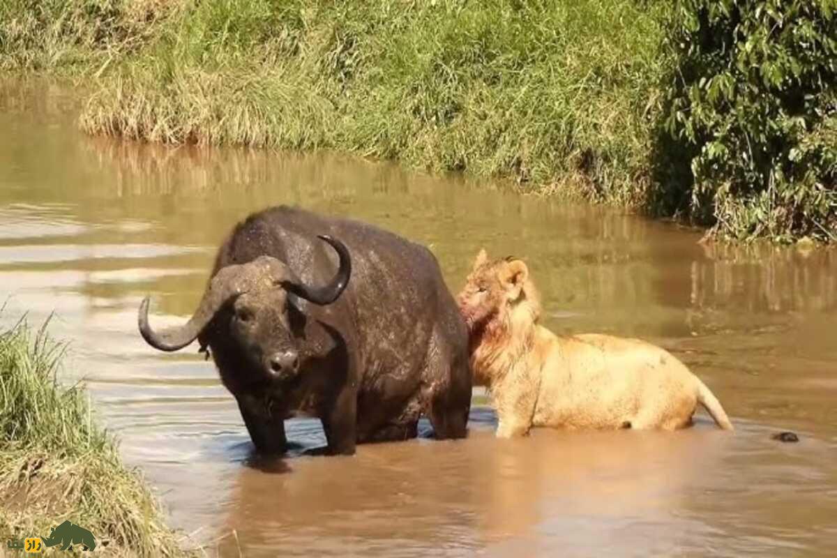 راز بقا: شیر‌ها (Panthera leo) از شکارچیان رأس هرم غذایی در ساوانا‌های آفریقا هستند و اغلب از نقاط ضعف طعمه‌های بزرگ استفاده می‌کنند. در این صحنه، یک شیر با مهارت بالا از حضور گاومیش آفریقایی در برکه استفاده کرده تا آن را غافلگیر کند.