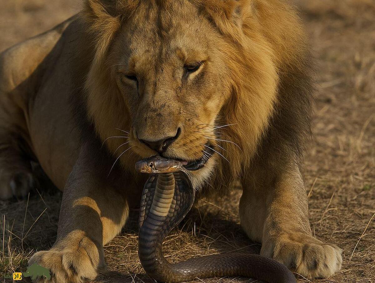 با یک جهش، شیر به سمت مار حملهور میشود. مار دفاع میکند — نه با فرار، بلکه با یک نیش. سریع، دقیق... و زهرآلود.