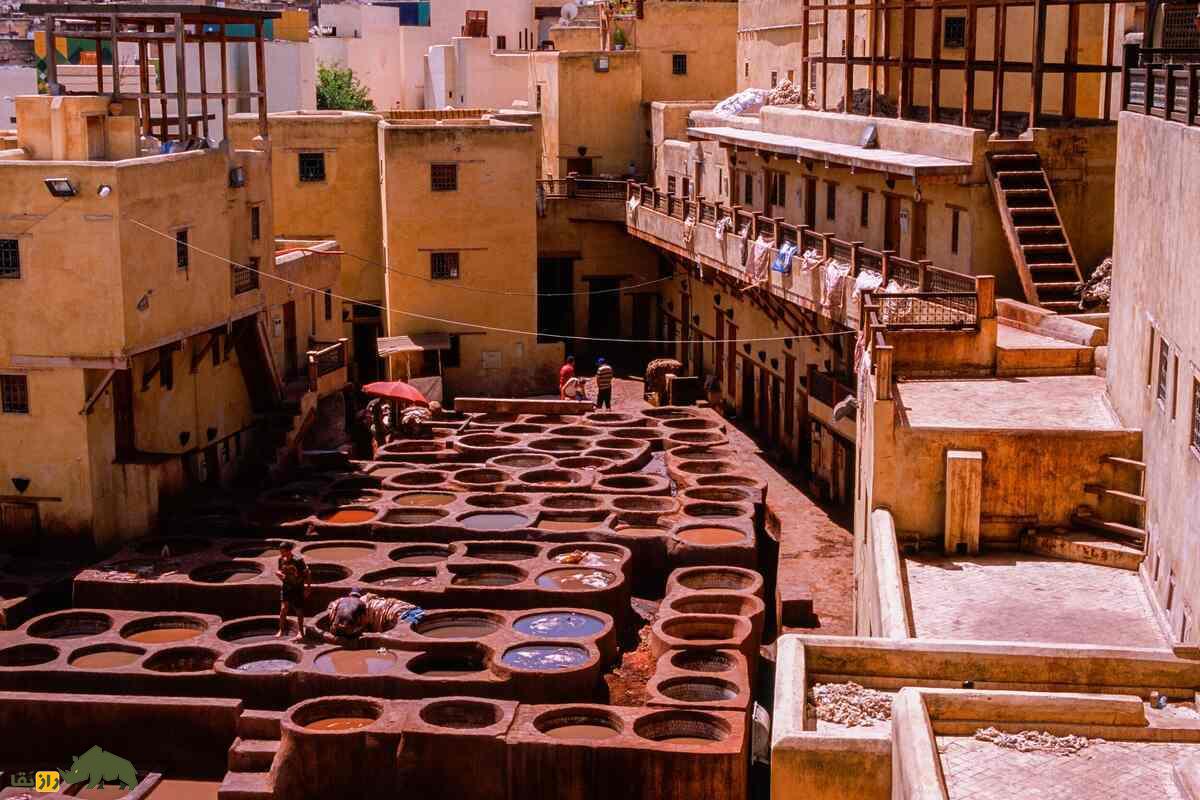 این دباغخانهها که قدمتشان به قرون وسطی بازمیگردد، هنوز هم به روشهای سنتی و بدون استفاده از ماشینآلات صنعتی فعالیت میکنند. تصویر حوضچههای رنگارنگی که در آن پوستهای حیوانات رنگآمیزی میشوند، یکی از نمادهای گردشگری مراکش است.