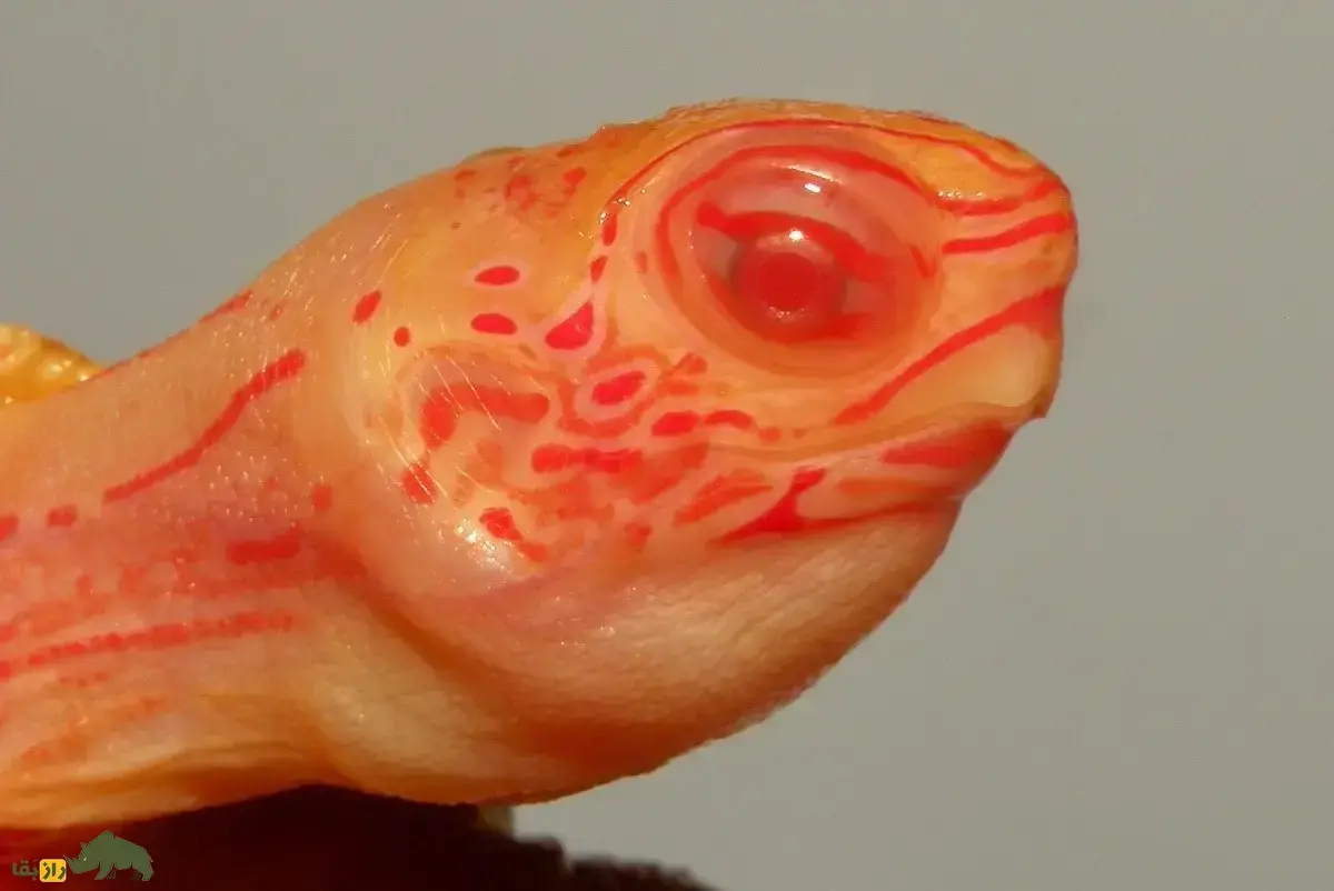 چشمهای آنها نیز به دلیل نبود رنگدانه معمولاً قرمز یا صورتی است، چرا که رگهای خونی در عنبیه نمایان میشوند. این کمبود رنگدانه، علاوه بر زیبایی منحصربهفرد، آنها را در برابر نور خورشید حساستر میسازد. احتمال تولد چنین لاکپشتی بسیار پایین است و تنها در میان دهها هزار نوزاد ممکن است یک نمونه آلبینو وجود داشته باشد.